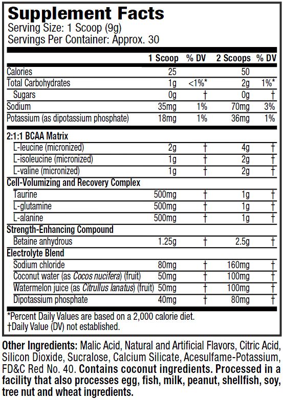 BCAA 2:1:1 (L-Leucina, L-isoleucina, L-valina); Mezcla para aumentar el volumen celular: (Taurina, L-glutamina, L-alanina); Compuesto para aumentar la fuerza: (Betaína); mezcla de electrolitos (Sodio (cloruro de sodio), Agua de coco (Cocos nucifera) (fruto), Jugo de sandía (Citrullus lanatus) (fruto) y Fosfato dipotásico)