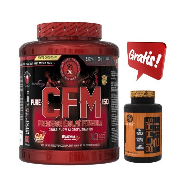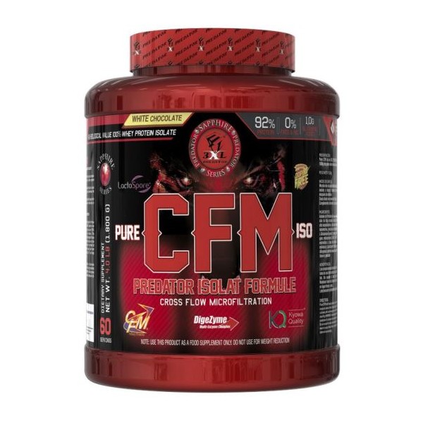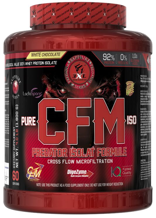 Pure CFM Iso de 3XL® Predator dentro de su línea Shapire Series es una proteína de aislado de suero de leche con un 92% de pureza y un 0% de hidratos de carbono y grasa lo que te garantiza unos 28 gramos de proteína de la mejor calidad posible en aislado de suero.