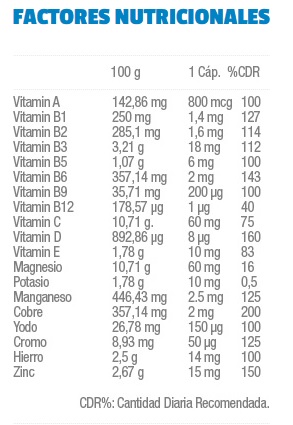 Fosfato cálcico, óxido de magnesio, gelatina (cápsula vacía), sulfato de hierro, gluconato de potasio, Vitamina C ácido ascórbico, sulfato de zinc, gluconato de maganeso, Vitamina E tocoferol, Vitamina B3 niacina, sulfato de cobre, Vitamina B5 ácido pantoténico, Vitamina A retinol, Vitamina D colecalciferol, Vitamina B6 piridoxina, Vitamina B2 riboflavina, Vitamina B1 tiamina, cloruro de cromo III, Vitamina B9 ácido fólico, ioduro potásico, Vitamina B8 biotina, Vitamina B12 cianocobalamina.