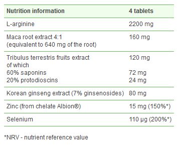 L-arginina, agente de carga - celulosa microcristalina; extracto de raíz de maca (Lepidium meyenii Walp.), extracto de fruto de Tribulus terrestris (Tribulus terrestris L.), agentes acristalamiento - alcohol de polivinilo (PVA), polietilenglicol, talco; agente antiaglomerante - sales de magnesio de ácidos grasos, dióxido de silicio; extracto de ginseng coreano (Panax ginseng coreano), Bisglicinato zinc (zinc quelato de aminoácido Albion®), selenio de sodio; colorantes - E-171, E-133.