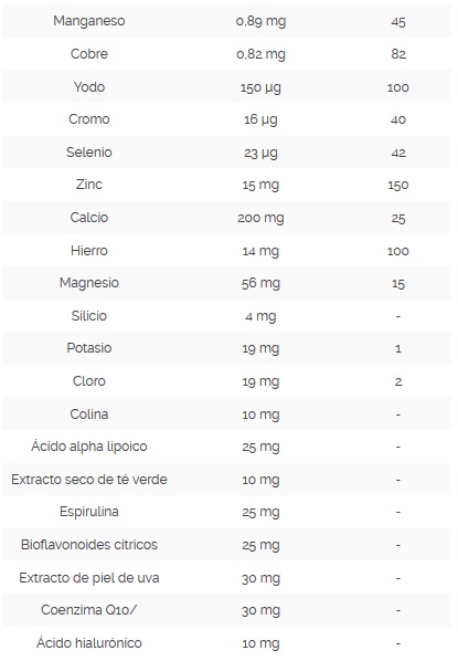 Carbonato de calcio, sulfato de magnesio, vitamina C (ácido L-ascórbico), fumarato ferroso, coenzima Q10, extracto seco de piel de uva (Vitis vinifera), ácido alpha lipoico (ALA), vitamina E (acetato de D,L-alfa-tocoferilo), espirulina, óxido de zinc, cloruro de potasio, vitamina B3 (nicotinamida), colina bitartrato, extracto seco de té verde (Camellia sinensis), bioflavonoides cítricos, ácido hialurónico, gluconato de manganeso, D-pantotenato cálcico, gluconato cúprico, dióxido de silicio, vitamina A (acetato de retinilo), beta-caroteno, vitamina B6 (clorhidrato de piridoxina), vitamina K (filoquinona), vitamina B2 (riboflavina), vitamina B1 (clorhidrato de tiamina), vitamina B9 (ácido pteroilmonoglutámico), yoduro de potasio, picolinato de cromo, D-biotina, selenito de sodio, vitamina D (colecalciferol), vitamina B12 (cianocobalamina) y antiaglomerantes (E-460 y E-470B).