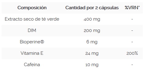 Extracto seco de té verde (Camellia sinensis), DIM (diindolilmetano), vitamina E (acetato de D,L-alfa tocoferil), Bioperine® (Piper nigrum) y antiaglomerantes (E-460 y E-470b).