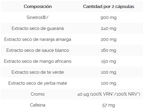 Sinetrol® [extracto de pomelo (Citrus paradisi), extracto seco de guaraná (Paulinia cupana) y extractos de naranja (Citrus sinensis)], extracto seco de guaraná (Paulinia cupana Kunth), extracto seco de naranja amarga (Citrus aurantium L.), extracto seco de sauce blanco (Salix alba), extracto seco de mango africano (Irvingia gabonensis, extracto seco de té verde (Camellia sinensis), extracto seco de yerba mate (Ilex paraguariensis), picolinato de cromo y antiaglomerantes E-460 y E-470b.
