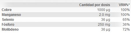 - Cobre: Está presente en dosis NRV 100% contribuye al mantenimiento del tejido conectivo en condiciones normales, al metabolismo energético normal, el funcionamiento normal del sistema nervioso, el transporte normal de hierro en el organismo y el funcionamiento normal del sistema inmunitario