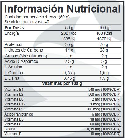 Aislado de proteína de suero por intercambio iónico, caseinato de calcio, fructosa, maltodextrina (polímeros, maltotriosa, maltosa y dextrosa), L-glutamina pura (99% de pureza), ácido D-aspártico, L-arginina, L-ornitina, L-lisina, (Vitamina B1, Riboflavina, Vitamina B6, Vitamina B12, Ácido Fólico, Ácido Pantoténico, Nicotinamida, Vitamina C, Biotina, Vitamina E) y edulcorante (Sucralosa E955).