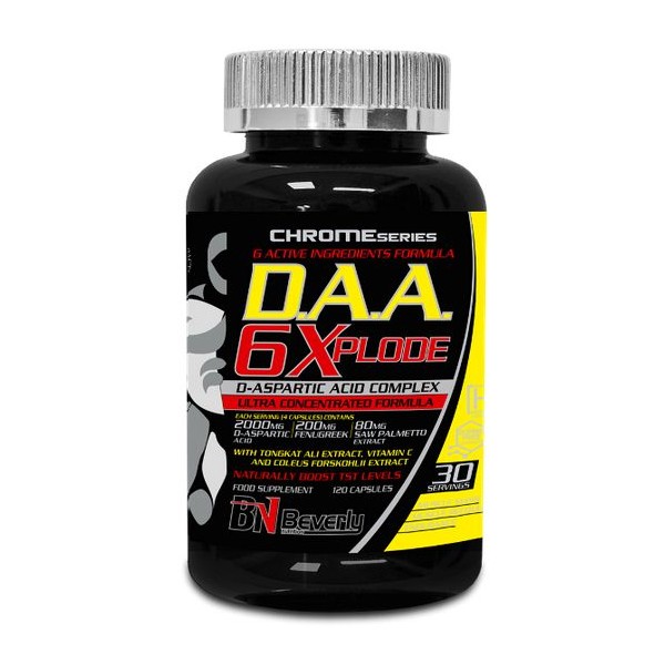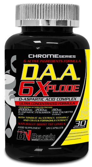 D.A.A. 6 Xplode de Beverly Nutrition es una fórmula en cápsulas que proporciona 2 gramos de ácido de aspártico por servicio de 4 cápsulas, que además también contiene una dosis efectiva de extracto de tongkat ali, fenogreco, extracto de coleus forskohlii, extracto de Saw Palmetto y vitamina C para un mayor efecto anabólico.