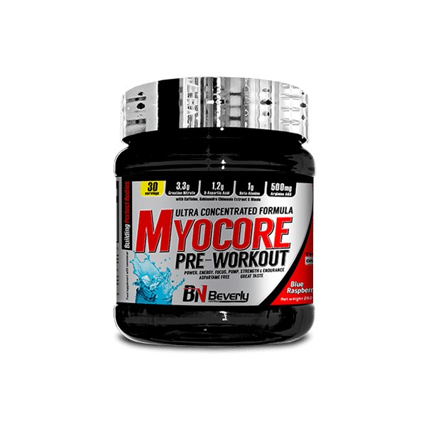 MyoCore de Beverly Nutrition es una fórmula de pre-entrenamiento ultraconcentrada en polvo que contiene una mezcla de creatina nitrato, ácido d-aspártico, beta-alanina, arginina AKG, cafeína, extracto de schisandra chinensis y niacina, que ha sido diseñada para proporcionar unos potentes bombeos muscualres, aumentar la fuerza, la energía, la resistencia y la concentración mental.