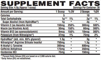 HydroMax® (65% Glicerol), Silicato de Arginina Inositol (Nitrosigine®), Acetil L-Tirosina, Cafeína Anhidra, Hordenina HCl, Vitamina C (como Ácido Ascórbico), Niacina (como Ácido Nicotínico), Vitamina B12 (Cianocobalamina), Potasio (como nitrato de potasio).