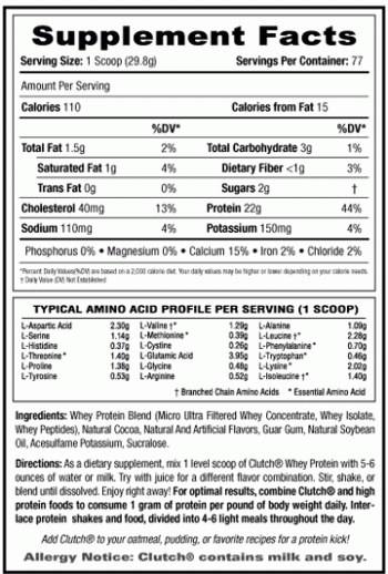 Clutch whey contiene proteínas de suero de leche de alta calidad. Proteína de suero de leche es insuperable en su capacidad para proporcionar proteínas de acción rápida que es fácilmente absorbida y utilizada por el músculo. Además de un sabor delicioso.