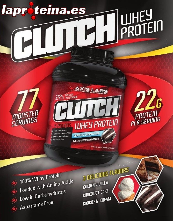 La proteína de suero CLUTCH WHEY de AXIS Labs es 100% proteína de suero, incluyendo aislado de suero, concentrado micro ultra filtrado de suero, y péptidos de suero.