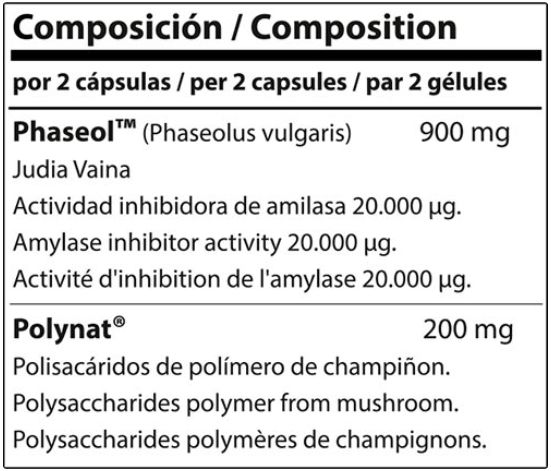 - Contiene 900 mg de Phaseol® y 200 mg de Polynat® por dosis de dos cápsulas.