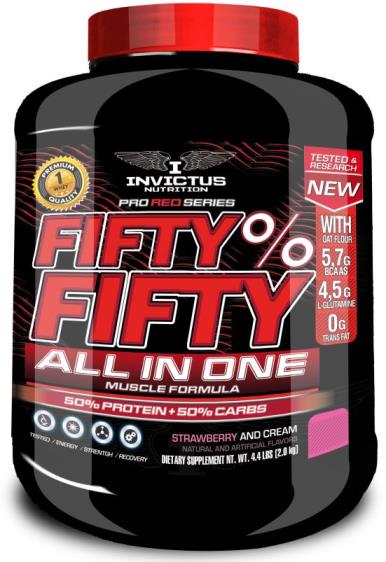 Fifty % Fifty All in One de Invictus Nutrition es una fórmula que combina aproximadamente un 40% de concentrado de suero de leche de la más alta calidad con un 50% de harina de avena ideal para aquellas personas que buscan aumentar la masa muscular pero evitando una ganancia indeseada de grasa.