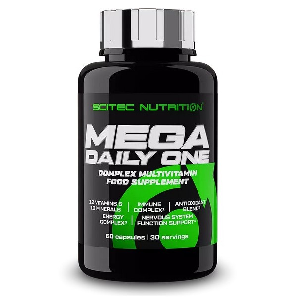 Mega Daily One de Scitec Nutrition es un suplemento en cápsulas que contiene la nueva versión de nuestra avanzada fórmula de multivitaminas y minerales extremadamente completa y fuerte con 26 ingredientes activos diseñada para usar a diario.