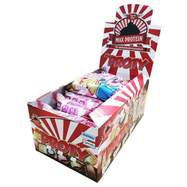 Max Proty de la línea Max Protein de Universal McGregror son unos deliciosos pastelitos con un excelente valor nutricional disponibles en 4 fabulosos sabores distintos (Cream&Choc, Choc&Choc, Pink&Cream y Bun&Cream), rellenos de crema y con cobertura exterior de chocolate.