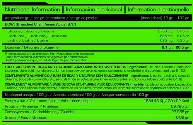 L-Leucina, L-Valina, L-Isoleucina, L-Taurina, ácido cítrico monohidrato, zumo de limón en polvo, aroma: limón, edulcorantes: sucralosa y colorante: E-102.