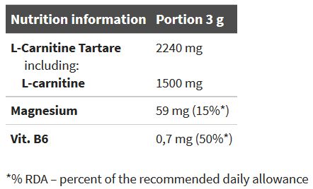 Este excelente suplemento dietético enriquece la dieta con una dosis efectiva de L-carnitina. Está dirigido principalmente a los adultos físicamente activos que buscan una reducción del tejido graso subcutáneo o que quieren mantener el peso corporal en el nivel deseado. También está recomendado para cualquier persona, que como forma preventiva quiere ayudar al funcionamiento saludable del sistema cardiovascular, mitigando así el riesgo de aparición de ciertas enfermedades del corazón u otros trastornos del sistema circulatorio.