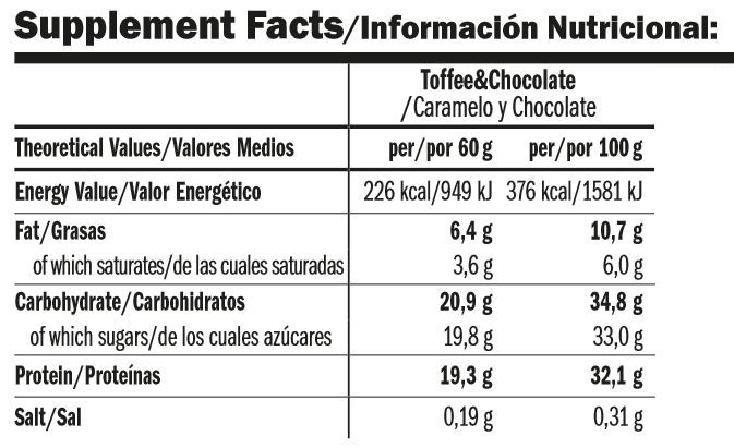 Como suplemento dietético para adultos sanos, tomar de 1 a 2 barritas al día en función de las necesiades de calorías y proteicas.