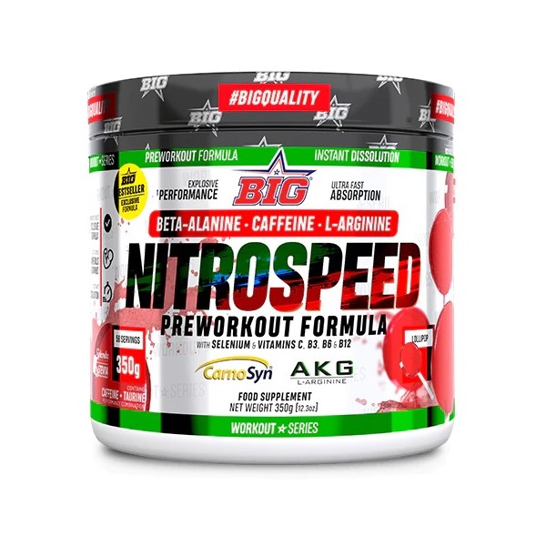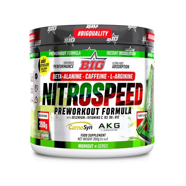 NitroSpeed de la marca Big es un pre-entreno concentrado en polvo de última generación diseñado para mejorar la intensidad y el rendimiento durante el entrenamiento que contiene los mejores compuestos potenciadores del óxido nítrico y estimulantes del sistema nervioso central.