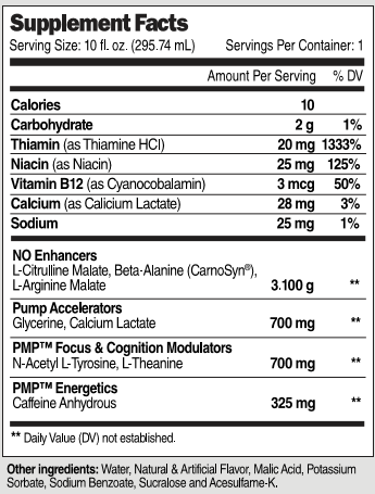 Mezcla de potenciadores de óxido nítrico (Beta-Alanina (Carnosyn®), L-Arginina malato, L-Citrulina Malato), aceleradores del bombeo muscular (glicerina, lactato de calcio), moduladores de la atención y la concentración mental (N-acetil L-tirosina, L-teanina), PMP™ Energético (Cafeína anhidra), Tiamina (como mononitrato de tiamina), Niacina, Vitamina B-12, Calcio (como Lactato de Calcio), Sodio (como cloruro sódico).