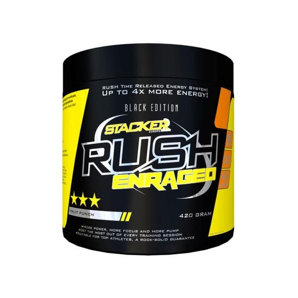 Rush Enraged va camino de convertirse en el producto para antes del entrenamiento más popular de Europa. Su exclusiva composición se basa íntegramente en pruebas realizadas con atletas de élite. La fórmula se ha revisado y mejorada en varias ocasiones.