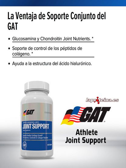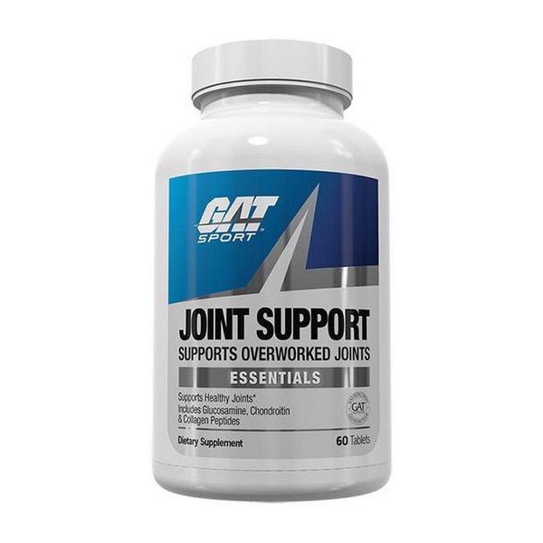 Joint Support de GAT™ Sport es un suplemento en tabletas que contiene 1,5 gramos de glucosamina, 500 mg de condroitin sulfato, 250 mg de colágeno hidrolizado, 100 mg de Boswellia serrata y 20 mg de ácido hialurónico diseñado para potenciar la salud de las articulaciones y favorecer la regeneración del cartílago articular.