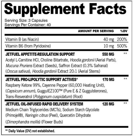 JetFuel apoyo y regulación del apetito (acetil L-carnitina, colina bitartrato, Hoodia gordonii (partes aéreas), extracto de semilla de Mucuna pruriens (50% L-dopa), extracto de Crocus sativus (azafrán) (0,3% safranal), extracto 20:1 de Hoodia gordonii (tallos aéreos)), JetFuel soporte activo pro-lipolítico (Cetona de frambuesa (99%), pimienta cayena (60,000 HU (capsicum annum), guggulEZ100® (pure E&Z guggulesterones), Trans-resveratrol (polygonum cuspidatum) (raíz)), JetFuel sistema con aceite de infusión para una rápida entrega (Glicolato de almidón sódico (Primojel®), Triglicéridos de cadena media (MCT), naringina cítrica (piel), quercitina dihidrato, (dimorphandra mollis) (botones florales)), Niacina, Vitamina B6.