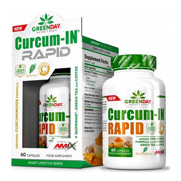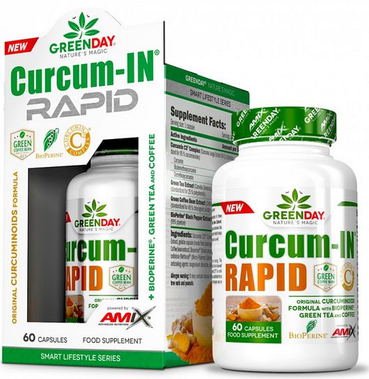 GreenDay® Curcum-IN® Rapid de Amix es un suplemento en cápsulas que contiene Curcumin C3® Complex una mezcla patentada que combina 3 curcuminoides potenciado con extracto de té verde, granos de café verde y BioPerine® que realza la biodisponibilidad de la curcumina.