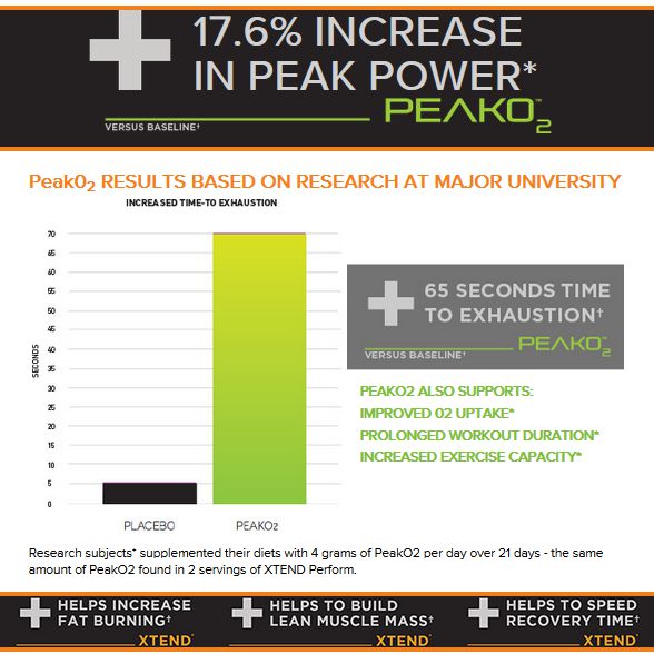 Entrenamientos más largos. PeakO₂™ puede aumentar tu resistencia como ningún otro suplemento. En un estudio clínico de 21 días de la Universidad de Carolina del Norte, en Chapel Hill, los usuarios que se suplementaron con PeakO₂™ mejoraron su tiempo de agotamiento en 70 segundos sobre su nivel de partida.