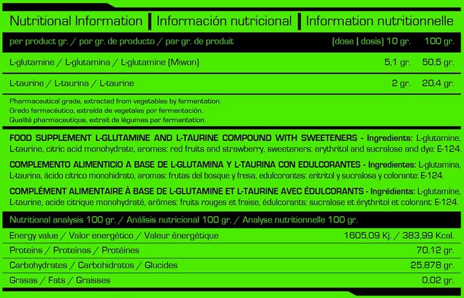 Glutamina en forma libre, de grado farmaceútico, extraídos de vegetales por fermentación y enriquecida con taurina.
