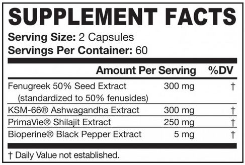Extracto de semillas de fenogreco (estandarizado a 50% fenusides), KSM-66® extracto de Ashwagandha, extracto PrimaVie® Shilajit, Bioperine® extracto de pimienta negra.