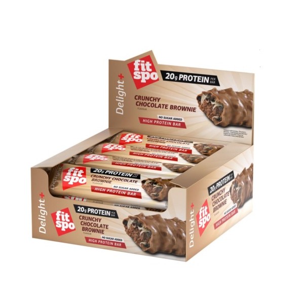 Las nuevas barritas Delight+ Crunchy Choco Brownie de FitSpo son unas deliciosas barritas de 60 gramos que te proporcionan 20 g de proteína por unidad y que son muy bajas en azúcar (solo 2 por barrita) pero que tienen el sabor de cualquier barrita de tipo Snickers convencional.