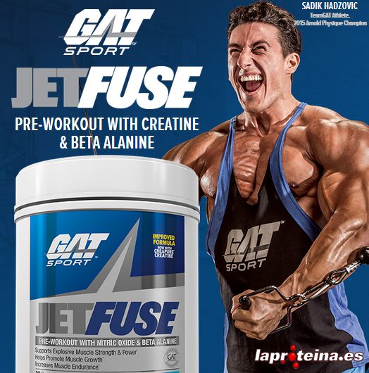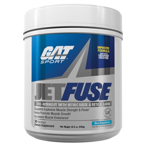 JetFUSE de GAT™ Sport es la nueva fórmula de pre-entrenamiento todo en uno con óxido nítrico, beta alanina y creatina Creapure®, que ha sido diseñada para proporcionar unos explosivas ganancias de fuerza, promover el crecimiento de la masa muscular e incrementar la resistencia muscular.