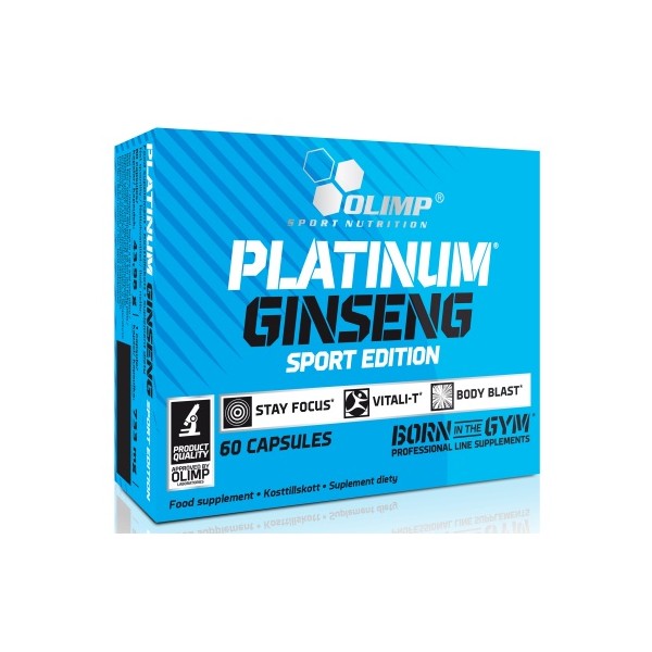 Platinum Ginseng Sport Edition de Olimp Sport Nutrition es un suplemento en cápsulas que proporciona 550 mg por cápsula de una combinación de extracto de raíz de ginseng koreano (Panax ginseng C.A. Mey.), extracto de raíz ginseng americano (Panax quinquefolius) y extracto de grano de cebada (hordeum vulgare L.) diseñado especialmente para mejorar la atención mental, el funcionamiento del sistema cardiovascular y aumentar la eficiencia aeróbica y anaeróbica.