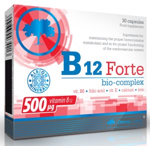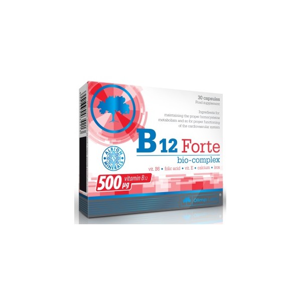 B12 Forte™ Bio-Complex de Olimp Sport Nutrition es un suplemento en cápsulas que contiene una alta dosis de 500 µg de vitamina B12 reforzada con vitamina B6, ácido fólico, vitamina E, hierro y calcio en forma de quelatos de aminoácidos de calcio y hierro altamente absorbibles.