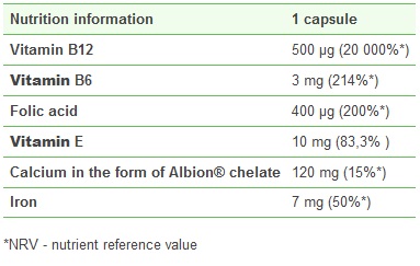Carbonato de calcio, bisglicinato de calcio, cianocobalamina - vitamina B12, agente de carga - celulosa microcristalina, bisglicinato ferroso, acetato de DL-alfa-tocoferilo - vitamina E, agente antiaglomerante - estearato de magnesio, hidrocloruro de piridoxina - vitamina B6, ácido pteroylmonoglutamico - folato, cápsula (gelatina, color: E 171).