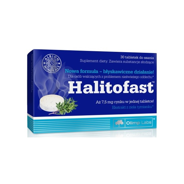 HalitoFast™ de Olimp Sport Nutrition es un suplemento en tabletas masticables que proporciona 7,5 mg de zinc en forma de quelato de aminoácido altamente absorbible (Albion® zinc amino acid chelate) y extracto de tomillo (Thymus vulgaris L.) para combatir el mal aliento, mantener un equilibrio ácido-base adecuado, además de tener un efecto calmante en la garganta.