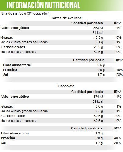 Sabor toffee de avellana: mezcla de proteínas orgánicas (Pisane® C9 aislado de proteína de guisantes, proteína de arroz, proteína de coco, proteína de granada, proteína de calabaza), aromas (avellana, toffee), cloruro de sodio, edulcorante (glucósidos de esteviol).