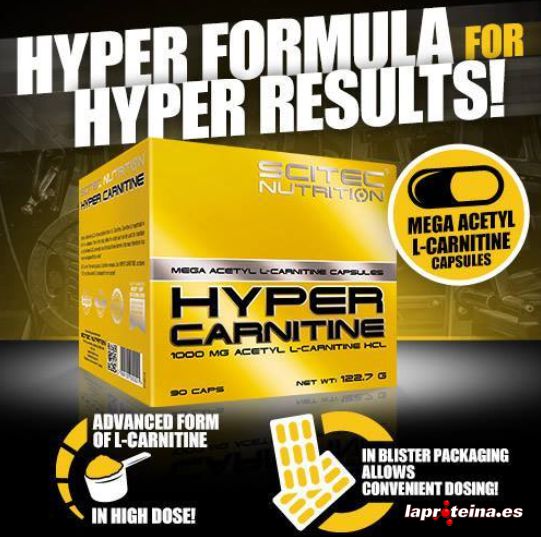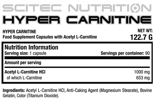 Hyper Carnitine de Scitec Nutrition es un suplemento en cápsulas que proporciona 1.000 mg de clorhidrato de acetil L-carnitina por dosis de 1 cápsula.