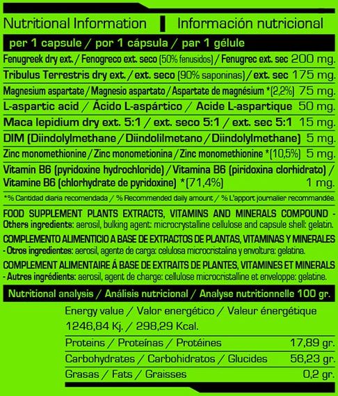 Extracto seco de fenogreco (50% fenusidos), extracto seco de tribulus terrestris (90% saponias), magnesio aspartato, ácido L-aspártico, extracto seco de maca lepidium 5:1, extracto seco de brócoli, zinc monometionina, vitamina B6, aerosil, agente de carga: celulosa microcristalina y envoltura: cristalina.