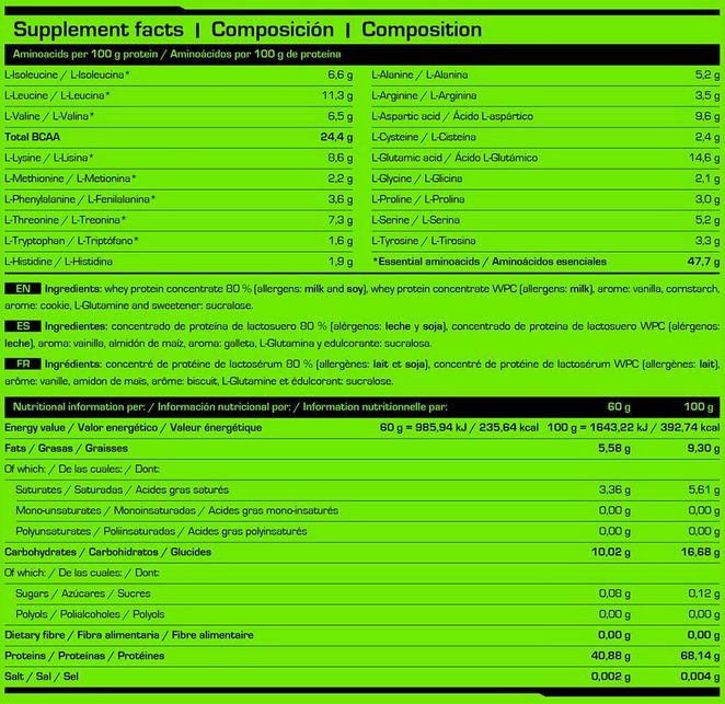 Whey Protein WPC 80%, proteína láctea concentrada 33%, L-Glutamina (Kyowa®), aroma: chocolate-galleta, cacao en polvo, edulcorante: sucralosa y almidón de maíz pregelatinizado.