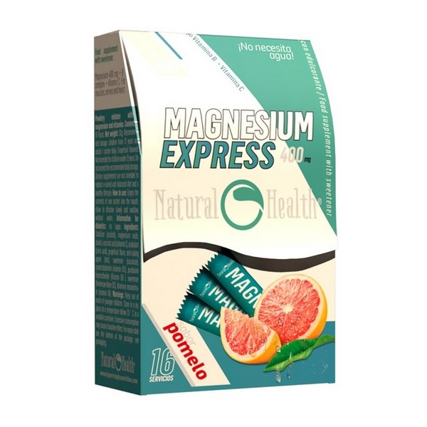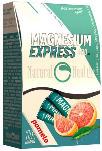 Magnesium Express de Natural Health es un suplemento presentado en prácticos sobres de un solo uso de 32 gramos que contienen 400 mg de magnesion enriquecido con vitamina C, B1, B6 y B12, y que tienen la gran novedad de poder tomarlo sin necesidad de agua, lo que permite un uso muy cómodo.