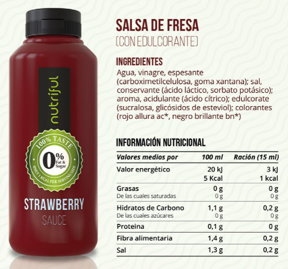 La Salsa de Fresa de Nutriful es una salsa con menos de 1 kcal por servicio de 15 ml, perfecta para acompañar tus comidas disfrutando de un delicioso sabor libre de grasas y azúcares.