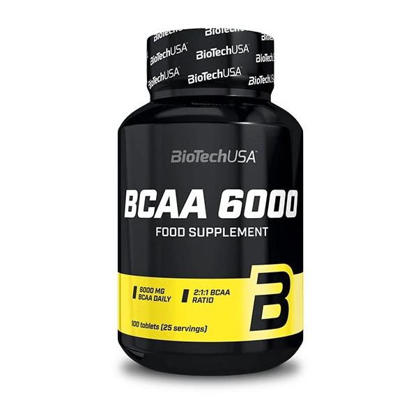 BCAA 6000 de BioTech USA es un suplemento en tabletas que proporciona 6.000 mg de aminoácidos de cadena ramificada - isoleucina, leucina y valina – en una proporción de 2:1:1 por servicio de 4 tabletas.