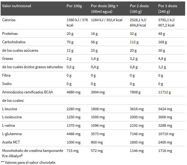 - Potenciado con BCAAs, L-glutamina, aceite MCT y creatina Kre-Alkalyn®.