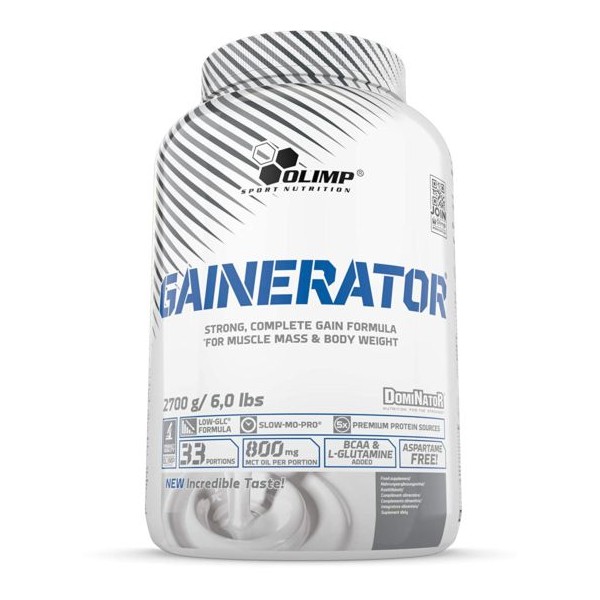 Gainerator® de Olimp Sport Nutrition es un suplemento en polvo que contiene una potente fórmula ganadora de peso que combina carbohidratos y proteínas debidamente combinados (caseína micelar, WPC, WPI, proteína de huevo ultra filtrada, WPH), enriquecida con BCAAs y L-glutamina, así como con aceite MCT y creatina Kre-Alkalyn®.