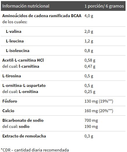 Aminoácidos ramificados BCAAs (22,2% L-valina, 13,3% L-leucina, 8,9% L-isoleucina), correctores de acidez – ácido cítrico, ácido málico; bicarbonato de sodio, 6,4% acetil-L-carnitina HCl, 6,4% sales cálcicas de ácido ortofosfórico, 5,6% L-tirosina, 5,6% L-ornitina-L-aspartato, espesante – goma arábiga; 3,3% extracto de raíz de remolacha (Beta vulgaris L.), aromas, emulgente – lecitinas (de soja); edulcorantes – acesulfamo K, sucralosa; colorantes: carotenos (A), carmines (B), riboflavina (C), E 150c (D), E 150d (E), E 133 (F), azul patente V (G), carmín índigo (H), clorofilas y clorofilinas (I), curcumina (J), antocianinas (K), extracto de pimentón (L), betanina (M), carbón vegetal (N).