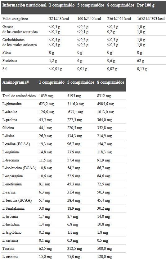 Agente de carga – celulosa microcristalina; L-glutamina, proteína hidrolizada de vacuno, L-alanina, taurina, antiaglomerante – sales de magnesio de ácidos grasos, dióxido de silicio; hidrocloruro de L-lisina, L-valina, L-ornitina-L-aspartato, L-isoleucina, L-treonina, L-metionina. # Los valores del aminograma pueden estar sujetos a fluctuaciones biológicas típicas de productos naturales.