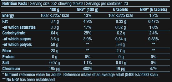 Fiber Complex contiene unas deliciosas tabletas masticables solubles en agua que contienen fibra dietética (inulina) y cromo. Estas tabletas no representan una gran ingesta de calorías, así que puedes tomarlas sin remordimientos cuando el hambre aprieta durante la dieta.