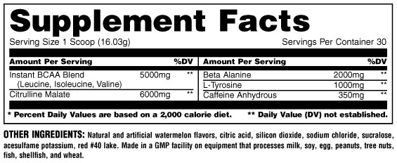 Cada servicio te proporciona 5 gramos de BCAAs, 6 gramos de citrulina malato, 2 gramos de beta alanina, 1 gramo de L-tirosina y 350 mg de cafeína anhidra.