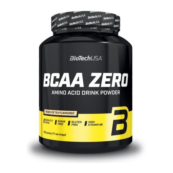BCAA Zero de BioTech USA es un suplemento en polvo con un agradable sabor que contiene una fórmula con 6 gramos de aminoácidos de cadena ramificada con ratio 2:1:1 entre leucina, valina e isoleucina, 700 mg de L-Glutamina y vitamina B6.